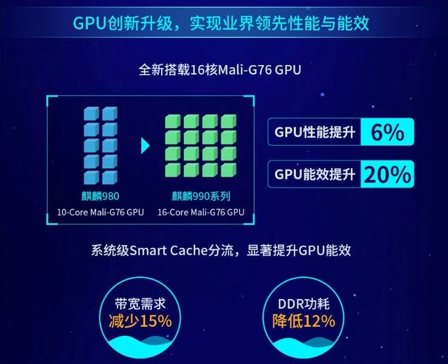 而在GPU方面,麒麟990 5G采用了Mali G76 MP16的GPU,通過提升GPU核心的數量,提高了GPU的性能和能耗比,雖然我們目前還沒有辦法確認麒麟990 5G在CPU和GPU性能上相對驍龍855+有多大的提升(跑分數據還得等Mate30的發布才能知道)。但可以確認的是,優化的架構配合7nm+EUV的工藝,麒麟990 5G在功耗上相比高頻的驍龍855+有不小的優勢。
