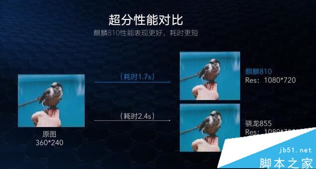 在超分性能對(duì)比方面,麒麟810的性能表現(xiàn)要比驍龍855更好,得益于AI能力強(qiáng)大,整體耗時(shí)更短。