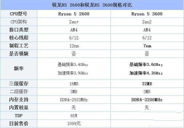 從規格上來看,Ryzen5 3600相比Ryzen5 2600主要在制程工藝、頻率、三級緩存以及內存支持上有著較大的改進,不過在目前售價上,由于新上市緣故,R5-3600要比上一代R5-2600貴了500元。