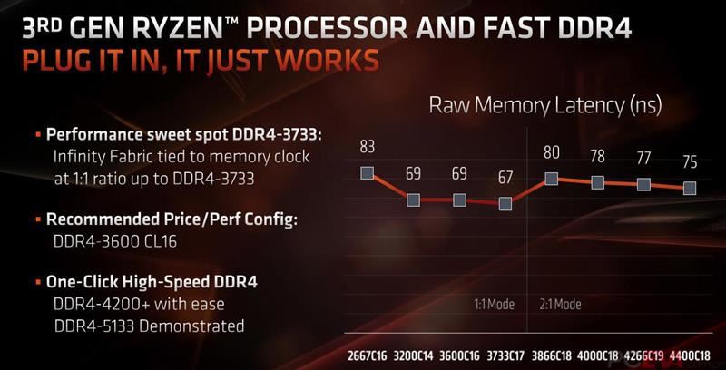 之前AM4平臺受限于內存頻率要與CPU內部的CCX總線頻率掛鉤,導致內存超頻比較困難,所以這一代可以支持分頻模式,內存頻率超過3733模塊化(不含)之后,CPU的CCX總線會運行在1:2的分頻模式,通過降低總線的頻率使電腦可用上4000以上的內存。