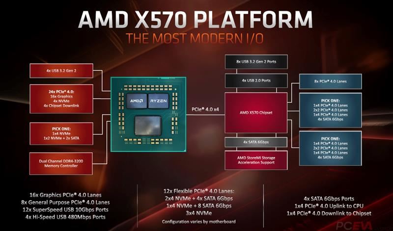 第三代銳龍另一個非常大的變化就是將整體的IO規格做了很大的調整,CPU內部引出的通道全部升級為了PCIe 4.0,搭配的X570主板的芯片組也從祥碩的ODM改為了AMD自己設計,不僅芯片組的通道數有了提升,而且從PCIe 2.0升級為PCIe 4.0。這使得AMD在主板PCIe規范上領先了Intel。