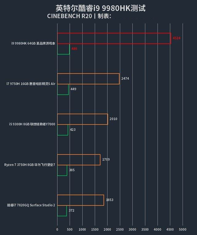 CINEBENCH R20更新之后,我們也在逐漸收集相關(guān)處理器的跑分情況,這里羅列了最近測(cè)試過的5款處理器跑分情況,英特爾酷睿i9 9980HK多核達(dá)到4524分,是目前該項(xiàng)目跑分最高的移動(dòng)級(jí)處理器,相對(duì)于目前銳龍移動(dòng)處理器最強(qiáng)的Ryzen 7 3750H來(lái)說(shuō),多核性能是其2.6倍。另外相對(duì)于自家目前應(yīng)用非常廣泛的英特爾酷睿i7 9750H處理器來(lái)說(shuō),多核性能也超出近2倍。