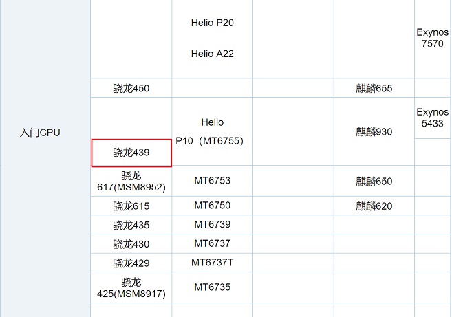 驍龍439在手機CPU天梯圖中的排名