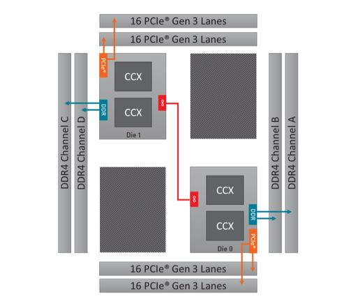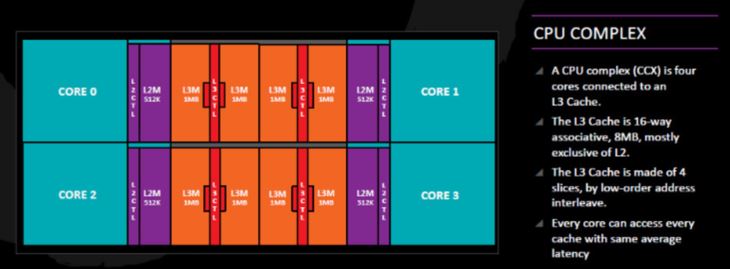 這一代的Zen+架構仍然由CPU Complex(CCX)組成,每一個CCX模塊仍然擁有4個“Zen+”物理核心,CCX中的每個核心有64K L1 緩存,每個核心有32K L1 D-緩存,每核擁有512 KB的L2緩存,所有核心共享一共8MB的L3緩存。所有物理核心均支持超線程(SMT)技術。從表面上來看與第一代產品沒有太多區別。由兩組CCX組成的一個Die基本上可以看做一個單獨的Ryzen7 2700芯片。