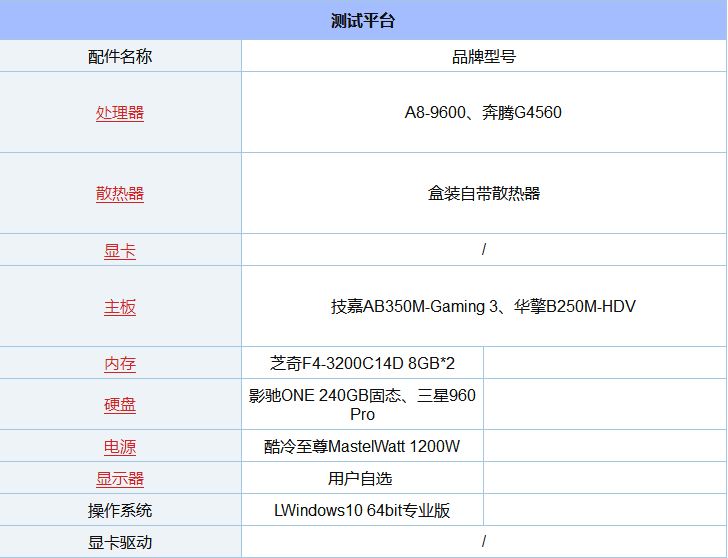 A8-9600處理器搭載的主板是選用技嘉AB350M-Gaming 3,Intel奔騰G4560處理器選用的主板是華擎B250M-HDV。