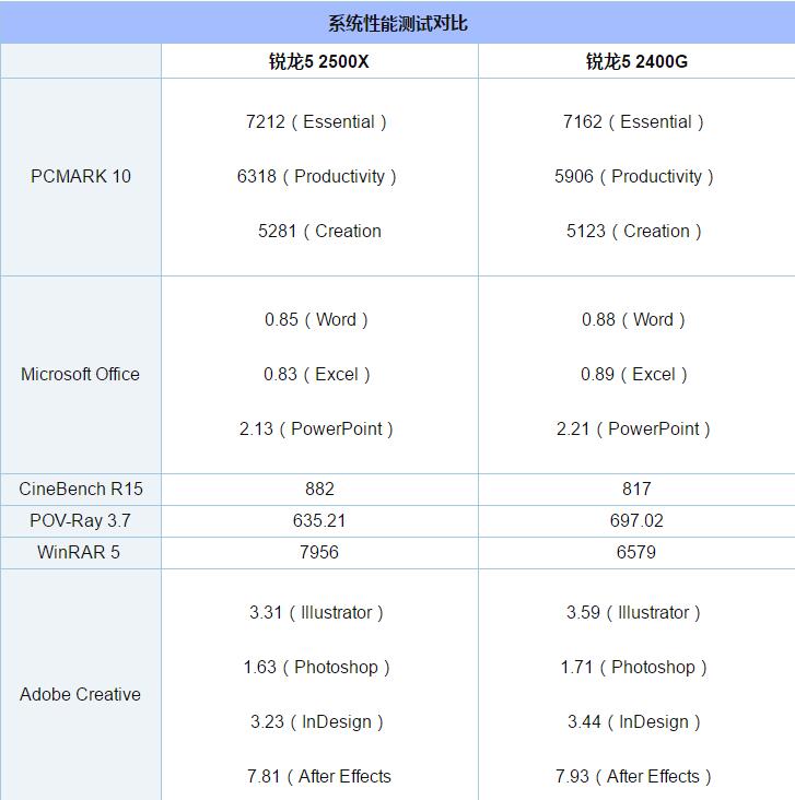 在CPU的性能上,不難看出Ryzen 5 2500X相比于Ryzen 5 2400G有明顯提升,提升幅度在5-10%之間。