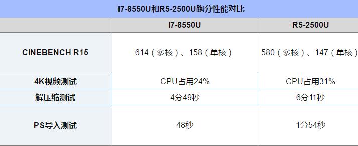 從對比中可以看出,主頻方面,Ryzen 5 2500U處理器要比i7-8550U高出0.2GHz,但i7-8550U在三級緩存方面是對方的一倍,差距有點明顯哦。