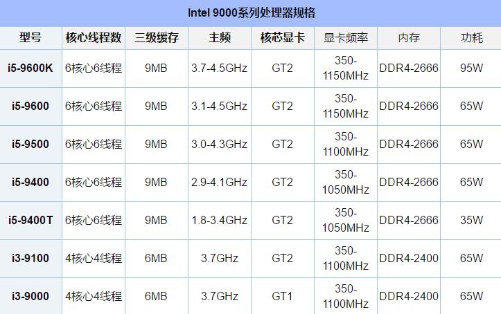 這7款酷睿9代處理器分別是i5-9600K、i5-9600、i5-9500、i5-9400、i5-9400T、i3-9100、i3-9000.新型號的基本規格如下。