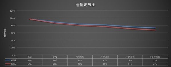 接下來,我們進行續航測試,方法為:接打電話、在線音樂各10分鐘,游戲、網絡視頻、在線視頻3個項目分別測試半個小時,中間不清理后臺,記錄每個項目結束后的剩余電量,外加8小時待機(清理全部后臺)。結果如下圖顯示,兩款設備最后分別剩余73%和67%電量,結合兩者的電池容量來看,兩款設備續航能力都還不錯,足夠支持一天正常用量。