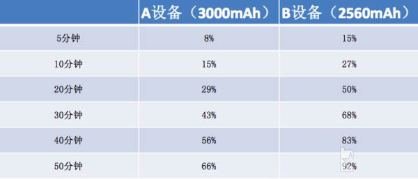 在快充方面,我們看到Helio X25設備上升較快。在20分鐘,積蓄了50%電量,達到1280mAh,而這款驍龍820設備則積蓄了近900mAh電量。這是因為充電器方面,Helio X25設備充電器輸出規格為5V/3A或8V/3A和12V/2A,輸出功率可達到24W,驍龍820設備輸出規格為5V/3A或9V/2A或12V/1.5A,輸出功率最多穩定在18W。