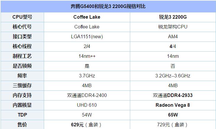 通過規(guī)格對比發(fā)現(xiàn),奔騰G5400基礎(chǔ)頻率相對更高一些,而在其他方面微微低于銳龍3 2200G,兩者差價100元,至于這100元價格差距能夠拉開多大差距還得進一步進行對比測試。