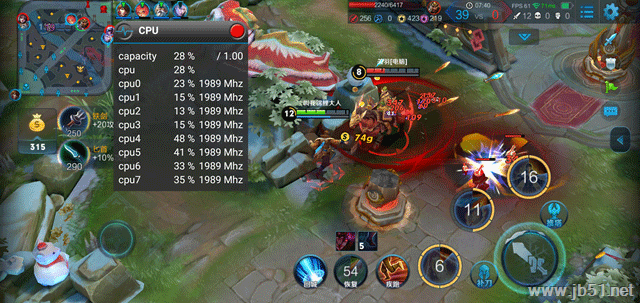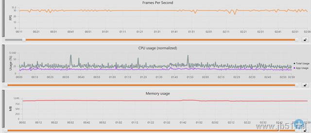 我們知道《刺激戰場》這款吃雞手游對處理器性能要求相對更高一些,以上圖片很好記錄了游戲的幀率、CPU利用率和內存利用率。由于即使開啟高畫質也只能開放30fps,所以達不到60fps效果。但除了小幅度有一定不穩定之外,Helio P60的游戲幀率基本上保持30幀左右,CPU占有率保持在16%左右,表現同樣令人滿意。