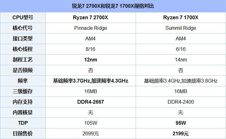 還是老規矩,我們先來了解一下R7 2700X和R7 1700X對比基本規格參數情況,初步了解一下這兩款處理器之間的差異。