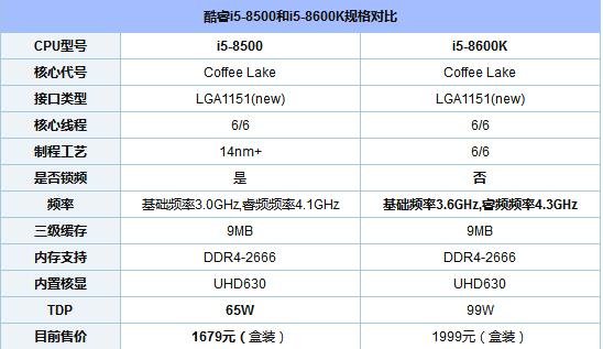 還是老規(guī)矩,我們先來了解一下i5 8500和i5 8600K對比基本規(guī)格參數(shù)情況,初步了解一下這兩款處理器之間的差異。