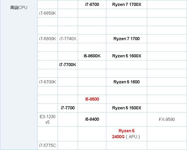 與對手Intel平臺相比,R3 2200G對標的是i3 8100,CPU性能稍低,但核顯能夠秒殺對手。R5 2400G則對標的是i5 8400,同樣是CPU綜合性能稍微弱一些,但GPU性能可以秒殺對手。綜合以上這些因素,我們大致就能知道R3 2200G和R5 2400G在CPU天梯圖中的排名位置了。