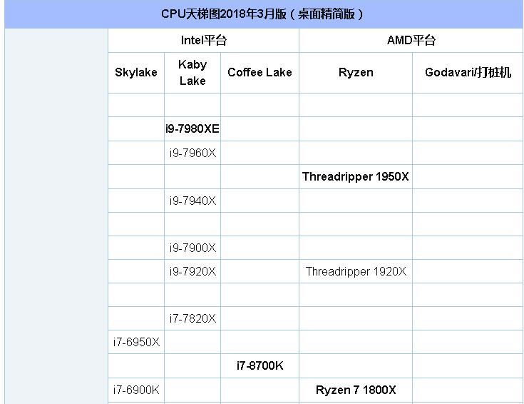 以上就是2018年3月桌面CPU天梯圖更新想要表達的重點內容。最后補充一點,以上天梯圖為精簡版,主要保留Intel和AMD近幾代主流CPU,部分老型號處理器未一一展示,想要了解更多可以看看“武林網”往期的天梯圖更新。