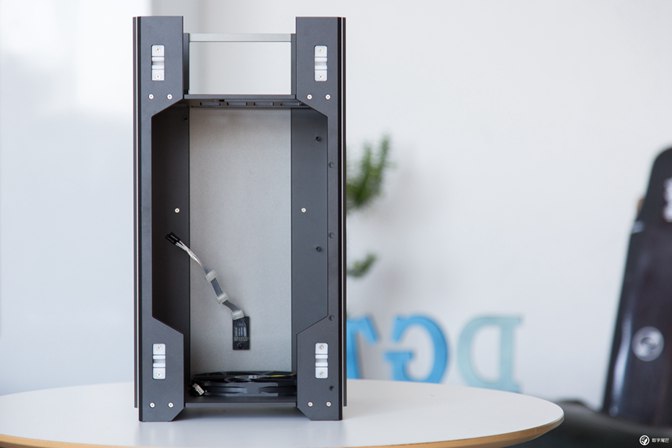在機箱的背面(沒錯,這個是背面,別搞錯了),我們除了能看到電源鍵,還能看到頂部的一個開口,這個開口是用于走線及連接其他設備的,但設計在頂部似乎有些不太合理?別急,我們先看看內部再說。