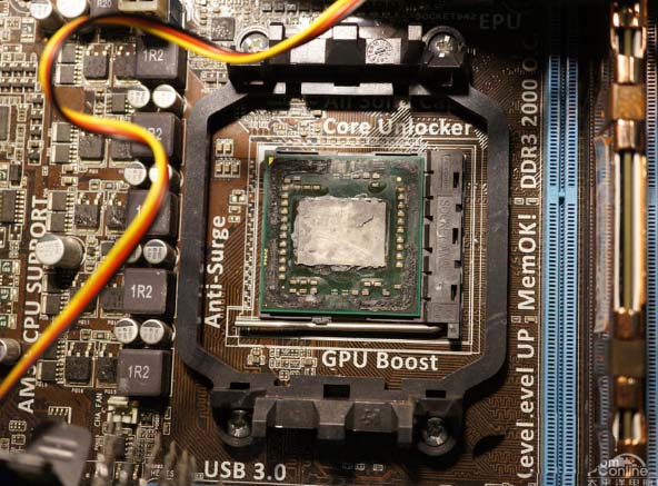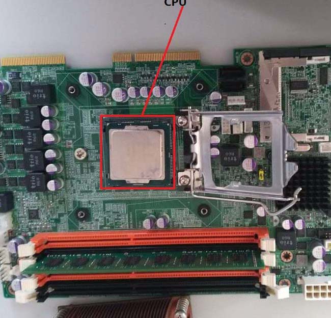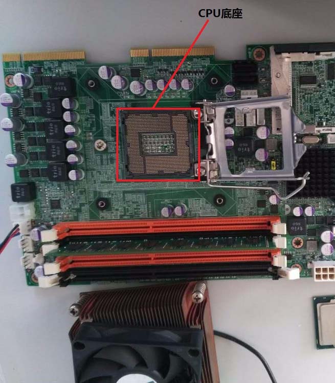 1、提供一個超級準確的方法,如果是整機就拆機,拆到露出如下主板,其中紅色框框是存放CPU的地方,現在上面架了風扇。