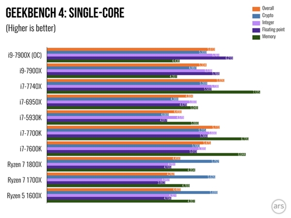 所以基本的規律還是維持到GeekBench 4,多核性能還是i9-7900X、i7-6950X、Ryzen 7 1800X的排列,而單核性能還是i7-7740X、i7-7700K最占有,所以游戲玩家是不是要考慮來一塊7740X呢?