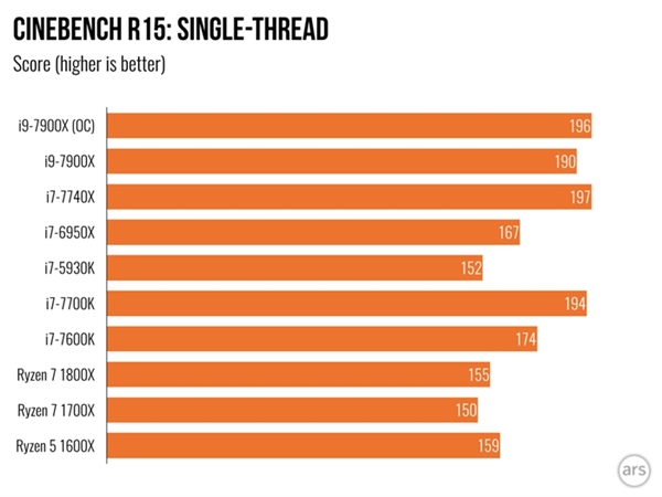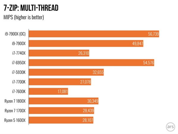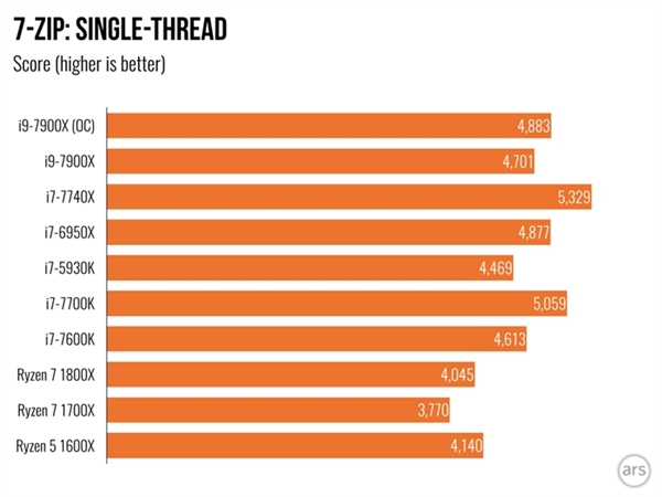 在POV Ray測試環節當中,基本的趨勢也是i9-7900X、i7-6950X、Ryzen 7 1800X的降序,在7-Zip壓縮測試當中i9-7900X的多線程敗給i7-6950X,雖然還是比Ryzen 7 1800X要高一籌,然而在單核性能測試當中,最受矚目的依然是4核8線程規格的i7-7740X、i7-7700K。