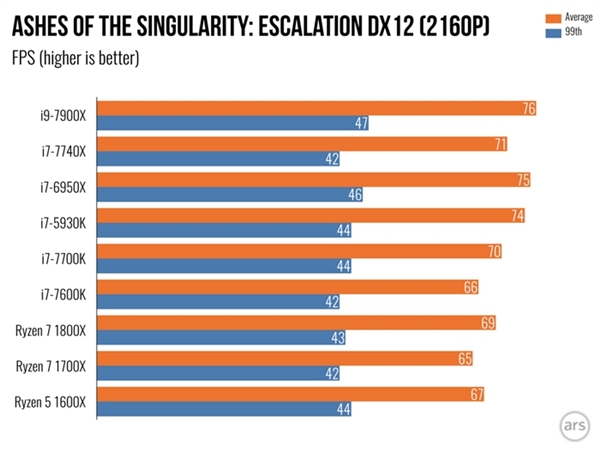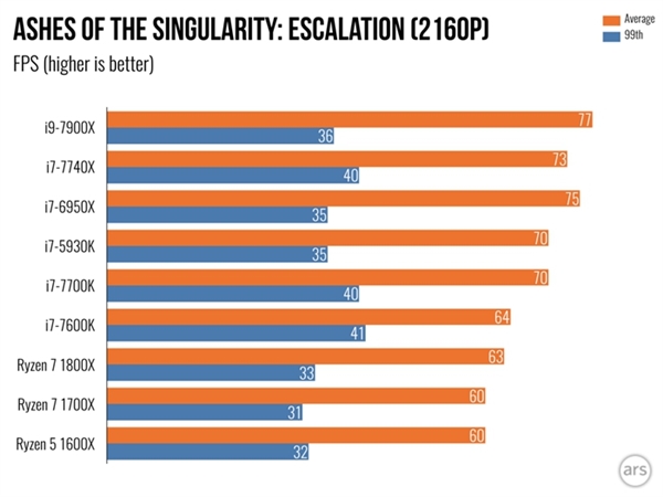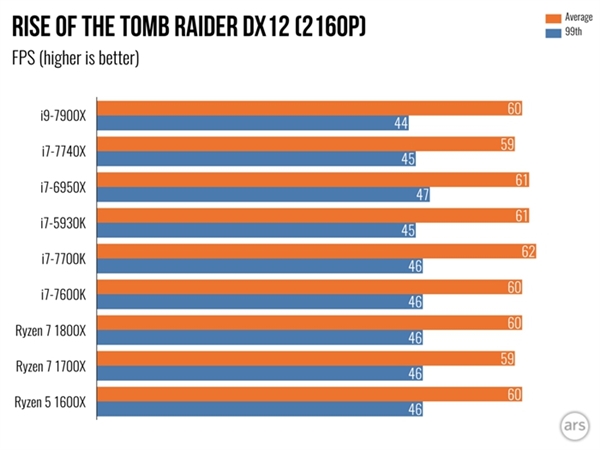 而在2K分辨率下,有可能是因為顯卡出現瓶頸,Ryzen 7 1800X拿下117幀,而i7-7740X往上都能拿到120、121幀,而在4K分辨率下,大家的性能都非常接近。