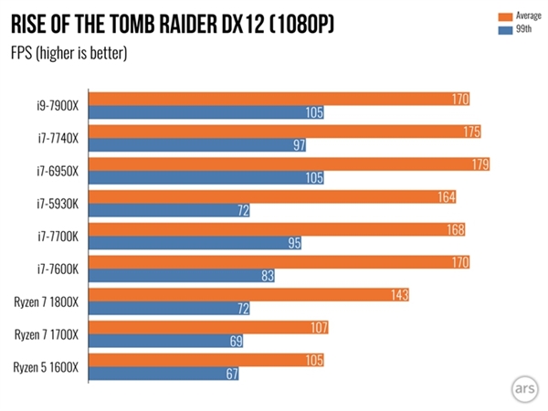 從份額來看,專業用戶的數量肯定遠遠少于游戲玩家,那么Skylake-X、Kabylake-X實際的游戲性能呢?首先來看看《古墓麗影:崛起》的性能,在DirectX 12模式,1080P分辨率下,我們都可以看到最高幀數屬于i7-6950X、i7-7740X,而i9-7900X游戲性能不及i7-6950X,雖然要比Ryzen 7 1800X高一些。