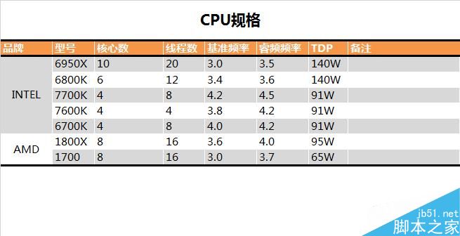 這次一共測試了七顆CPU,7700K、7600K、1800X、1700都是今年新發(fā)布的CPU。6950X、6800K、6700K則作為對(duì)比組。