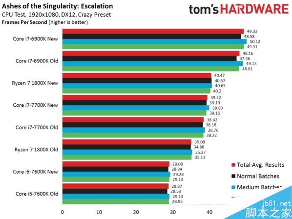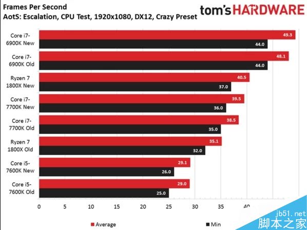在CPU測試中,TH的結果顯示Core i7-6900K及Core i7-7700K平均幀也有所提升,但增幅較小,性能提升并不明顯,而Ryzen 7 1800X新舊補丁下平均幀從35.1fps提升到了40.5fps,提升15%,已經超過Core i7-7700K了。