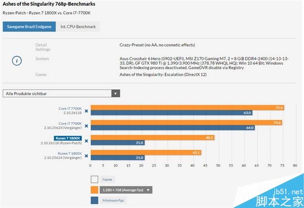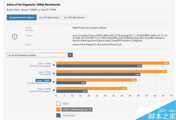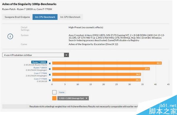 在這個測試中,Ryzen 7 1800X從舊補丁的墊底一躍成為第一,也逆轉了對Core i7-7700K的劣勢。