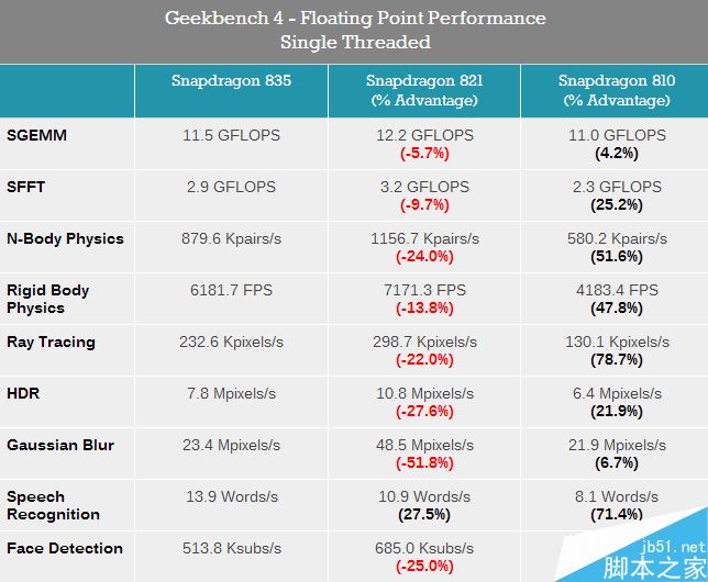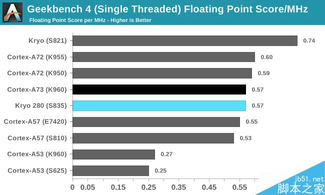 按照頻率計算,驍龍821是浮點效率最高的,驍龍835比其慢了足足23%,基本和麒麟960持平。