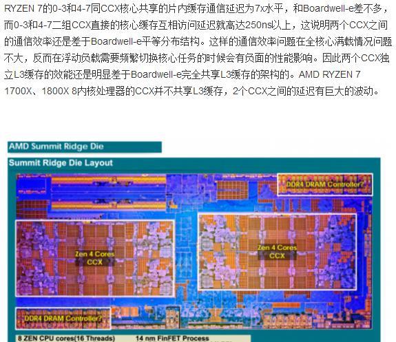 貼吧網友對銳龍AMD Ryzen處理器CCX的結構頗有微詞,同樣提出了L3緩存2個4核CPU群組交換數據時延遲過高的問題。
