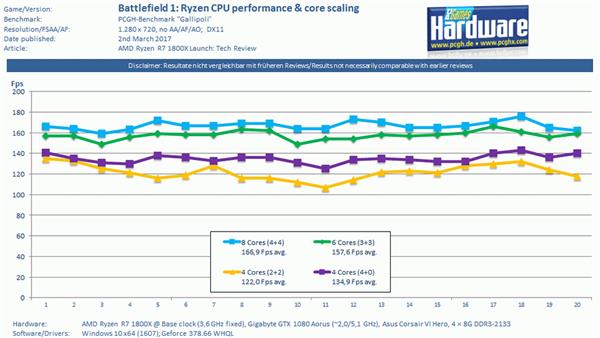 若想驗證AMD說法是否正確,可以看一下PCGH的游戲測試表格。PCGH分別測試了四種情況的游戲幀數,8核(4核心4線程)、6核(3核心3線程)、4核(2核心2線程)、4核(4核心0線程)。