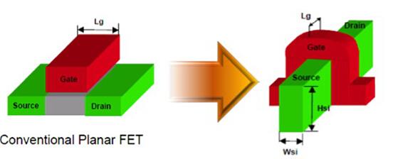 FinFET技術是什么意思呢?我們以上圖為例,Gate雖然越短,電流損耗越小,但是缺點也很明顯,就是它與下方的面積也會變窄,這樣就會導致Gate的通斷性變弱,“Source”和“Drain”之間會開始漏電,影響芯片的穩定性。FinFET技術的發明人——加州大學伯克利分校的胡正明教授提出了一種新結構,就是把Gate制做成右圖中的形狀,增大接觸面積,這樣Gate對電流通斷能力的控制就會重新增強,進一步減少Gate的寬度。