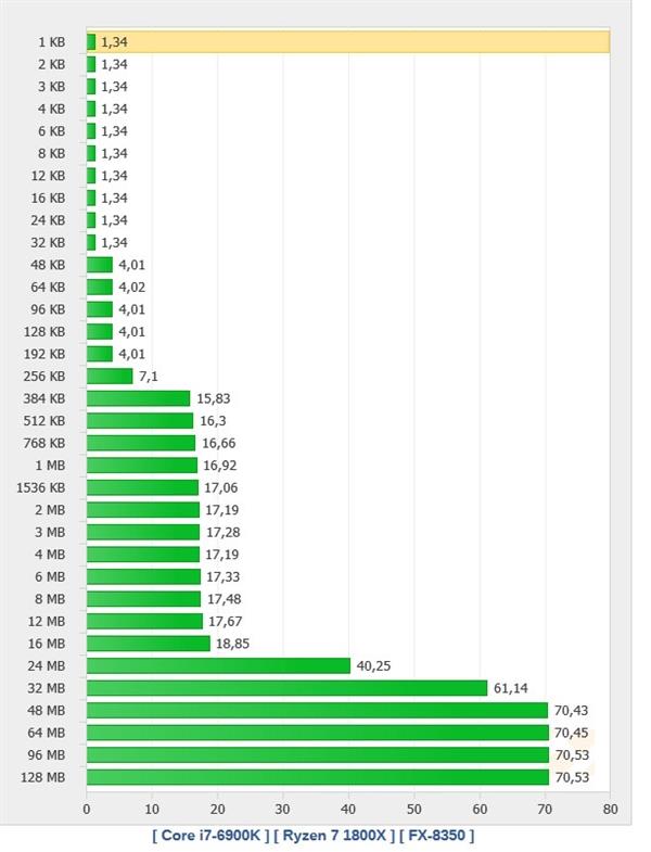 從表格中我們可以發現,Ryzen 7 1800X和i7 6900K相比,Ryzen 7 1800X在L1和L3上均落后于i7 6900K,只有在L2緩存性能上扳回一局。不過在L3緩存性能放面AMD的所有指標都要遠遠落后于Intel,延遲幾乎是對手的三倍。Ryzen緩存問題的嚴重性可見一斑,不過AMD官方并未對此發表評論,此BUG究竟是Ryzen 7 1800X的CCX結構所引起的,還是由Windows 10系統所引起的,我們暫時還不得而知。
