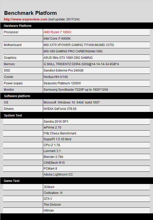 測(cè)試平臺(tái)與之前首發(fā)評(píng)測(cè)基本一致,只是X99主板換成了微星的X99 GAMING PRO CARBON,內(nèi)存頻率調(diào)至3200MHz,時(shí)序14-14-14-34,銳龍 AMD Ryzen 7 1800X的平臺(tái)只能插兩條,而Intel Core i7-6900K的平臺(tái)就插了四條開啟四通道,CPU保持默認(rèn)頻率,測(cè)試項(xiàng)目與之前的首發(fā)評(píng)測(cè)是一樣的。