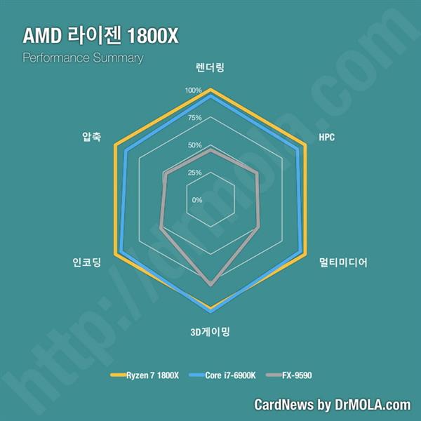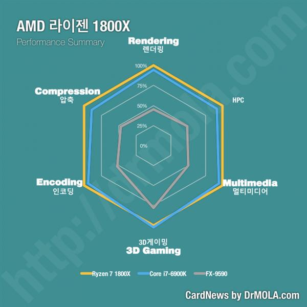 圖表中使用的是韓文,不過Reddit網站上已經有熱心群眾給大家做了注釋,最上方開始沿逆時針方向分別是渲染、壓縮、編碼、3D游戲、多媒體、HPC(計算性能)性能對比。了解測試內容之后,我們可以看到Ryzen 7 1800X全方位碾壓前代旗艦FX-9590,號稱世界首個5GHz處理器的它在后輩面前實在是沒什么面子了,各方面的性能都大幅落后了。