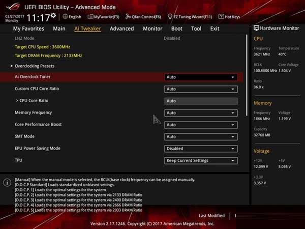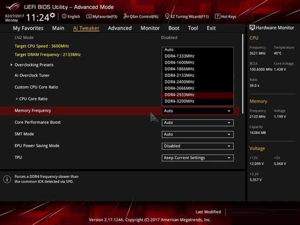 在這款華碩主板上,內存選擇頻率最高只能達到3200MHz,盡管目前AMD官方并沒有給出關于銳龍AMD Ryzen內存頻率的相關參數,但是華碩方面表示目前AMD限制了RAM內存調節選項,所以最高只能到3200MHz。而在測試中,芝奇DDR4 4000MHz 8GB*2只能超頻至2933MHz,無法達到3200MHz,說明目前AMD對內存的兼容性問題還沒有得到有效的解決。