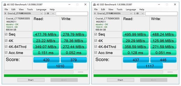 而在英睿達MX300測試中,銳龍AMD Ryzen7 1800X的讀取速度為477.76MB/s,寫入速度為278.79MB/s,4K讀取速度為23.22MB/s,4K寫入速度為78.36MB/s;i7 6700K讀取速度為495.99MB/s,寫入速度為488.24MB/s,4K讀取速度為29.29MB/s,4K寫入速度為125.96MB/s。可以看出1800X在這一項測試中明顯落后i7 6700K,不過幅度很小。