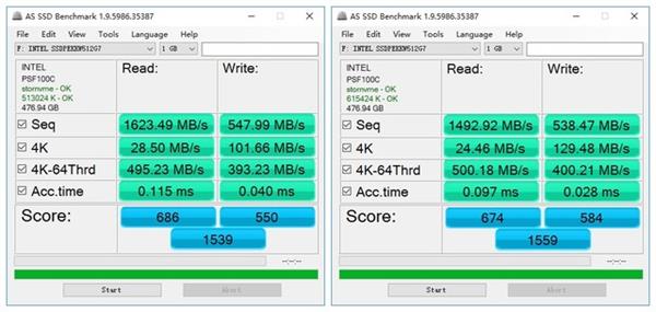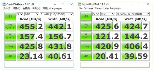 在Intel 600P測試中,銳龍AMD Ryzen7 1800X的讀取速度為1623.49MB/s,寫入速度為547.99MB/s,4K讀取速度為28.50MB/s,4K寫入速度為101.66MB/s;i7 6700K讀取速度為1492.92MB/s,寫入速度為538.47MB/s,4K讀取速度為24.46MB/s,4K寫入速度為129.48MB/s。1800X在連續讀寫速度有所領先,尋盤時間i7 6700K則更快一些,巧合的是二者的最終得分是相同的,平分秋色