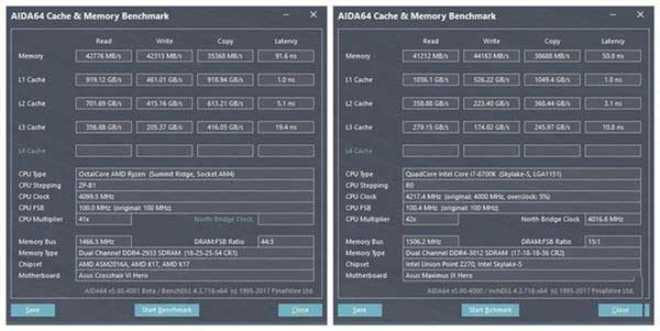銳龍AMD Ryzen7 1800X(左)、i7 6700K(右)
