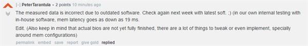 關于AMD處理器延遲過高這個問題,國外一名內部測試者表示:現有的測試程序,包括AIDA64內存測試都是過時的,會得出錯誤的測試成績。他們使用正確的軟件,內部測試得出的延遲為19ms(原文為ms,其實應該是ns),遠遠低于這個數字,比Skylake的IMC(46ns)更加出色。不過該測試者并沒有提及使用哪款軟件得出此數據,所以在內存延遲問題上,我們暫時不會妄下定論,期待AMD官方的回復。