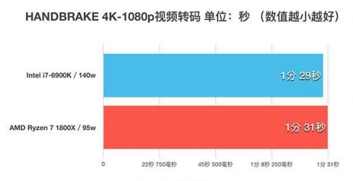 HANDBRAKE是國外一款非常常用的視頻轉碼軟件,雖然在國內不那么流行,但是其自帶的計時功能能夠很好的指示處理器的轉碼時間,作為測試非常合適。雖然AMD官方在做HANDBRAKE測試的時候,銳龍 AMD Ryzen 7 1800X對比i7-6900K是取得了完勝的佳績的,但是從我測試的情況似乎不一定。我采用的視頻源為4K分辨率2分鐘長度,最終結果是1800X與6900K不分伯仲,1800X以2秒的微弱劣勢告終。