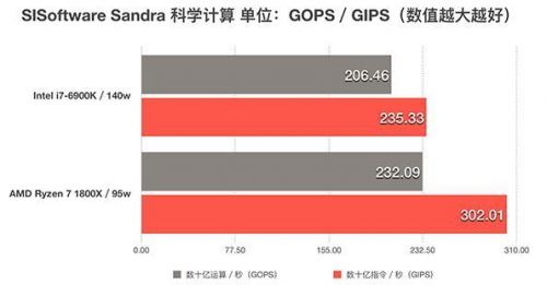 SISoftware Sandra算是比較老牌的CPU測試軟件了,準確性還可以。它主要能夠描述一款處理器的運算速度和指令執行速度。軟件提供了兩個參考單位一個是GOPS(數十億運算/秒)GIPS(數十億指令/秒)。在這項測試上,可以說銳龍 AMD Ryzen 7 1800X占盡優勢,尤其是指令的執行上面似乎要比i7-6900K高效不少。