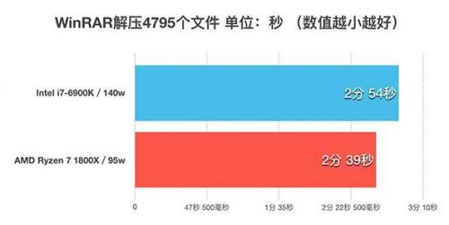 從測試的結果看,解壓這個日常的使用環境下,銳龍 AMD Ryzen 7 1800X的優勢非常明顯,比i7-6900K少等待了15秒,這個功夫腎好的朋友夠去衛生間尿個尿回來了。