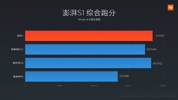 根據官方公布的信息我們得知,澎湃S1的安兔兔6.0跑分略高于聯發科Helio P20,首發機型是小米5C。