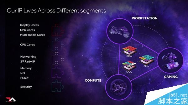 AMD將IP模塊分為顯示、GPU、多媒體、CPU、網絡、三方IP、內存、I/O、PCIe、安全等,無論是處理器還是圖形卡抑或者SoC片上整合方案,可根據需要進行搭建(Infinity fabric)。