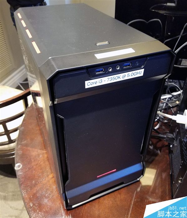 CES 2017上就展示了一臺基于i3-7350K的機器,還是個Mini-ITX SFF迷你小型機,處理器赫然超到了5GHz(50x倍頻),而且是風冷狀態(tài),使用了海盜船H115i散熱器,核心電壓1.44V。