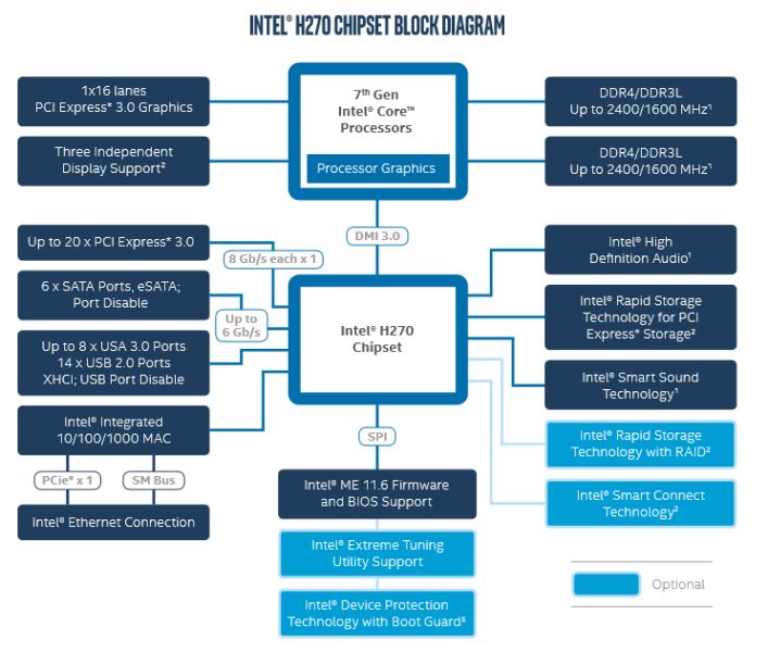 H170與H270方塊圖-記憶體頻率提升、PCIe通道增加支援Intel Optane記憶體