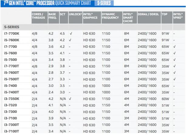 而臺式機處理器則包括91W的i7-7700K、i5-7600K,65W的和i7-7700、i5-7600和i5-7500,35W的是i7-7700T、i5-7600T、i5-7500T。