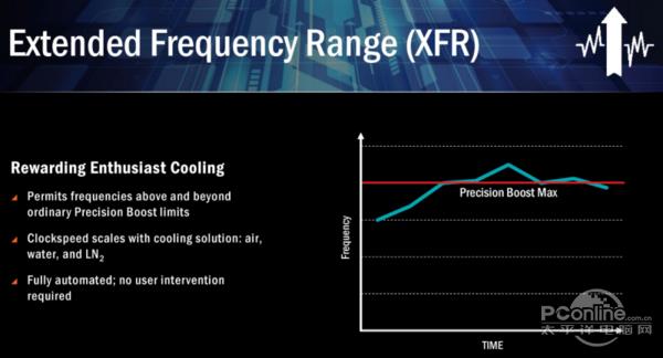 擴展頻率范圍(Extended Frequency Range-XFR):當系統感測到散熱能力提升時,XFR提升精準智能超頻(Precision Boost)頻率,以提高性能。